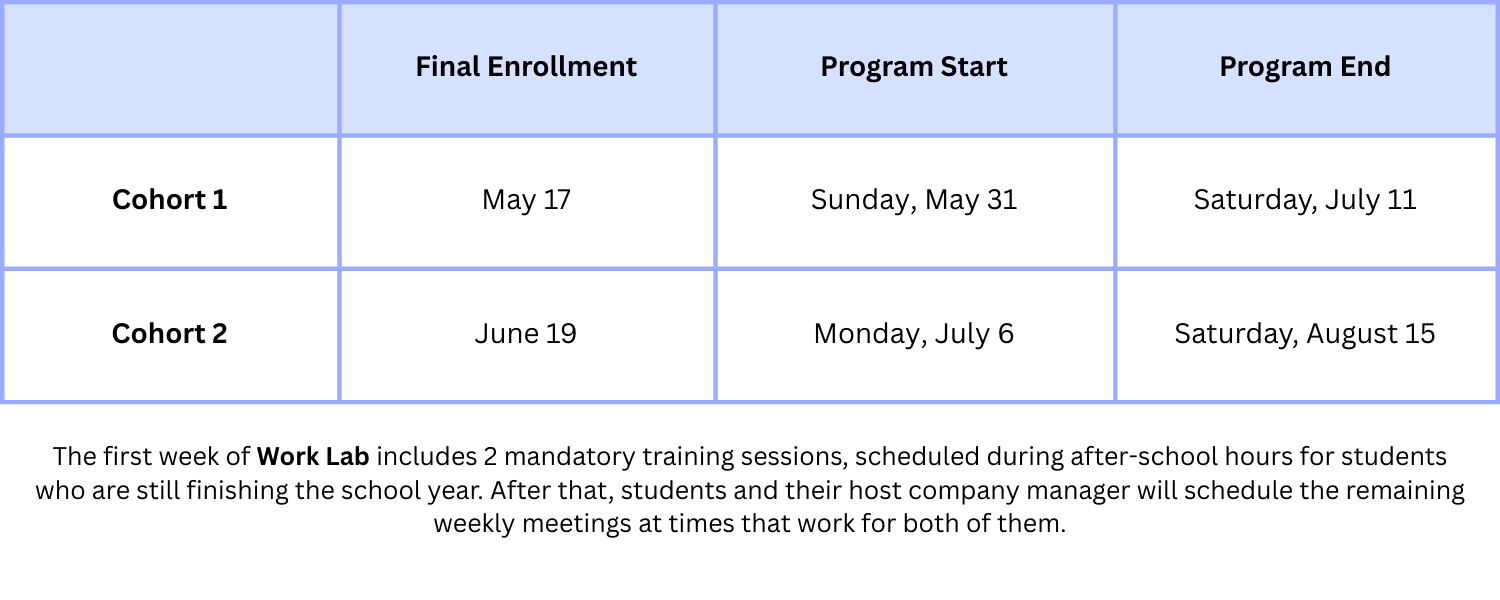 Polygence runs multiple Work Lab cohorts during Summer, each offering unique project opportunities and its own application deadline. Each cohort lasts 6 weeks: you'll start with around 10 hours of focused training, then move on to roughly 40 hours of project work, which can be completed at your own pace within the program period.